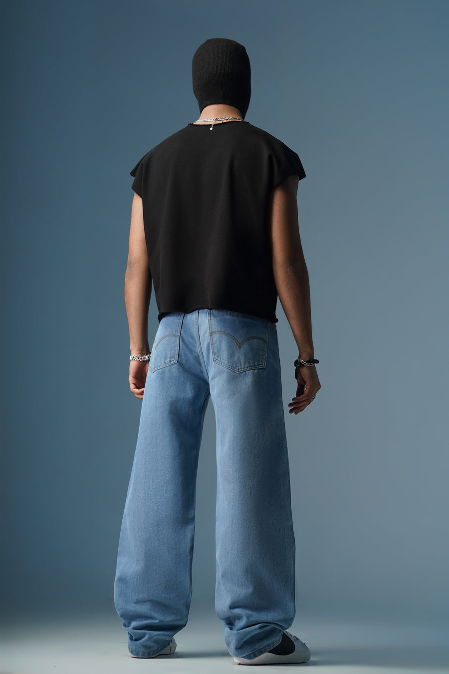 These jeans have a baggy fit with a fixed waistband.