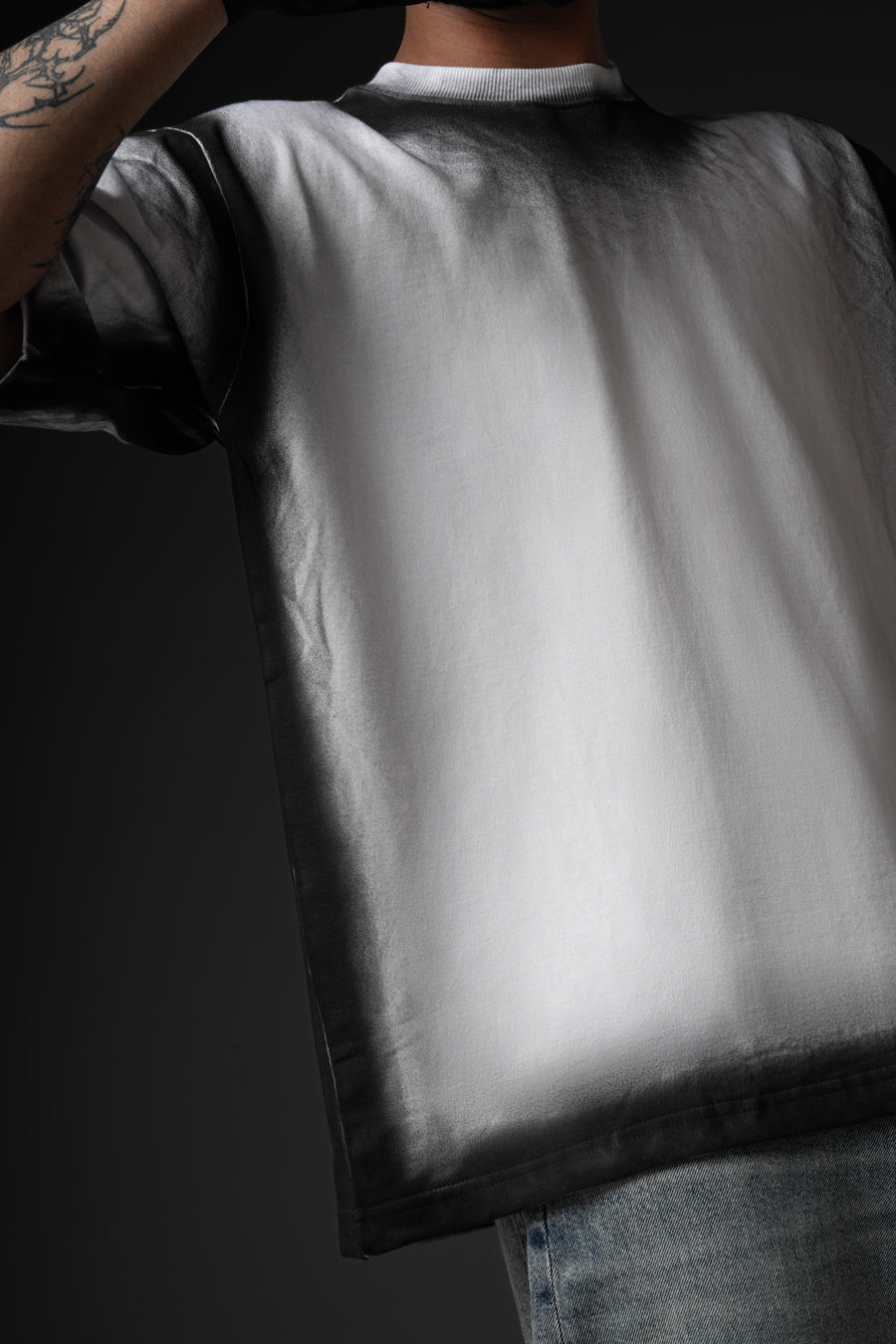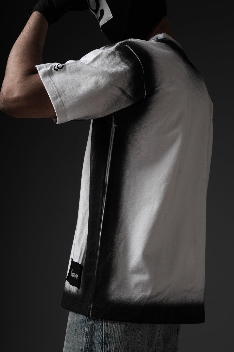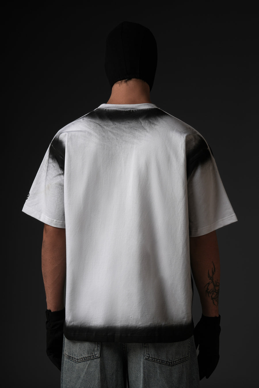 Cut from 100% cotton terry, this oversized tee channels street culture through a sharp monochrome gradient. The soft fade at the neckline sets a bold contrast, balanced by the structured silhouette. Finished with a signature brand patch at the hem, it embodies understated edge with refined execution.